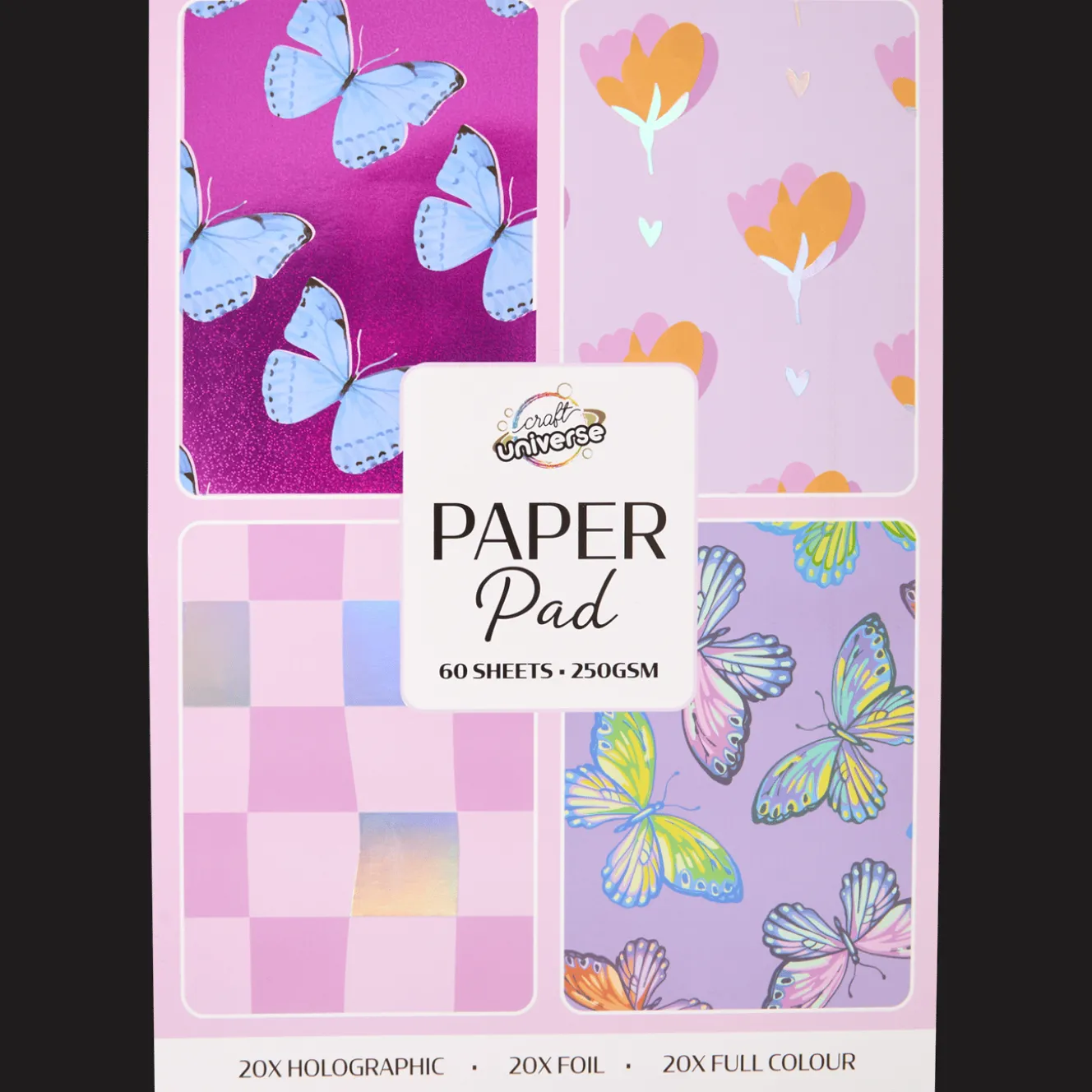 Multifunctioneel teken- en knutselblok met 20 vellen holografisch papier, 20 vellen foliepapier en 20 vellen gekleurd papier.