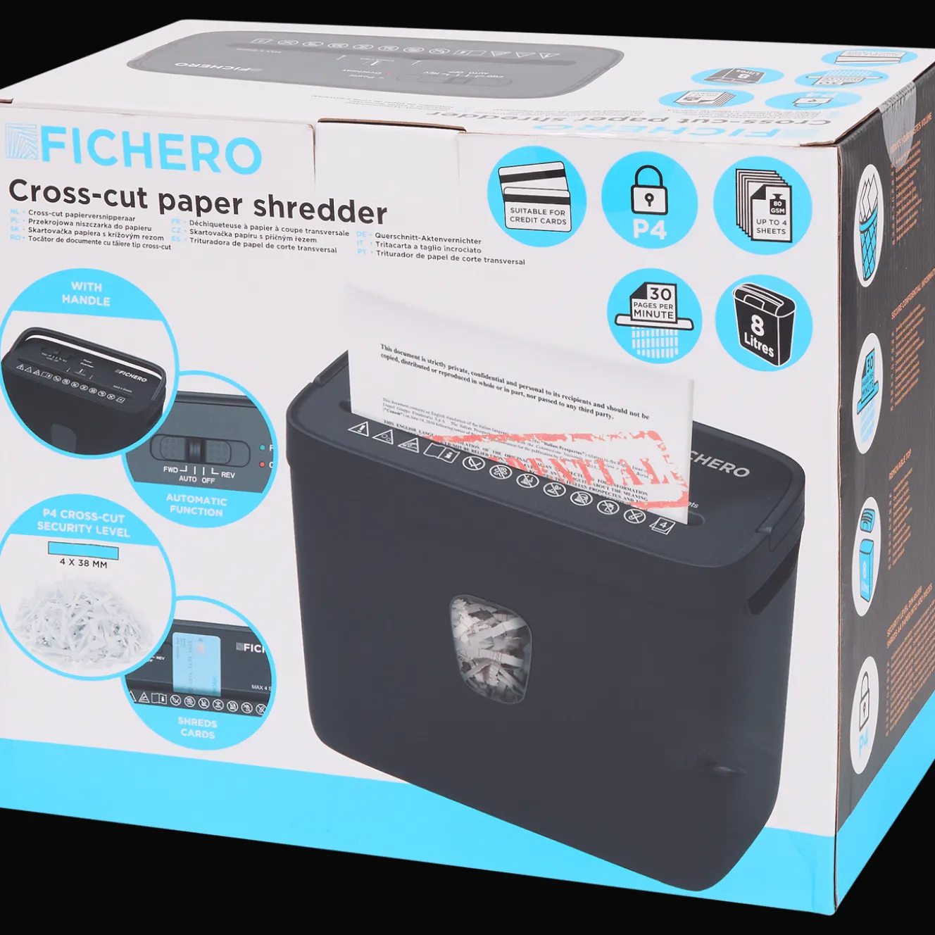 Gooi brieven, vertrouwelijke documenten, facturen en zelfs bankpassen veilig weg. Deze A4-papierversnipperaar heeft een capaciteit van 8 liter voor versnipperd materiaal en is compact zodat hij onder of op je bureau past. De versnipperaar is uitgerust met een reverse-knop om vastgelopen papier snel en veilig te verwijderen.