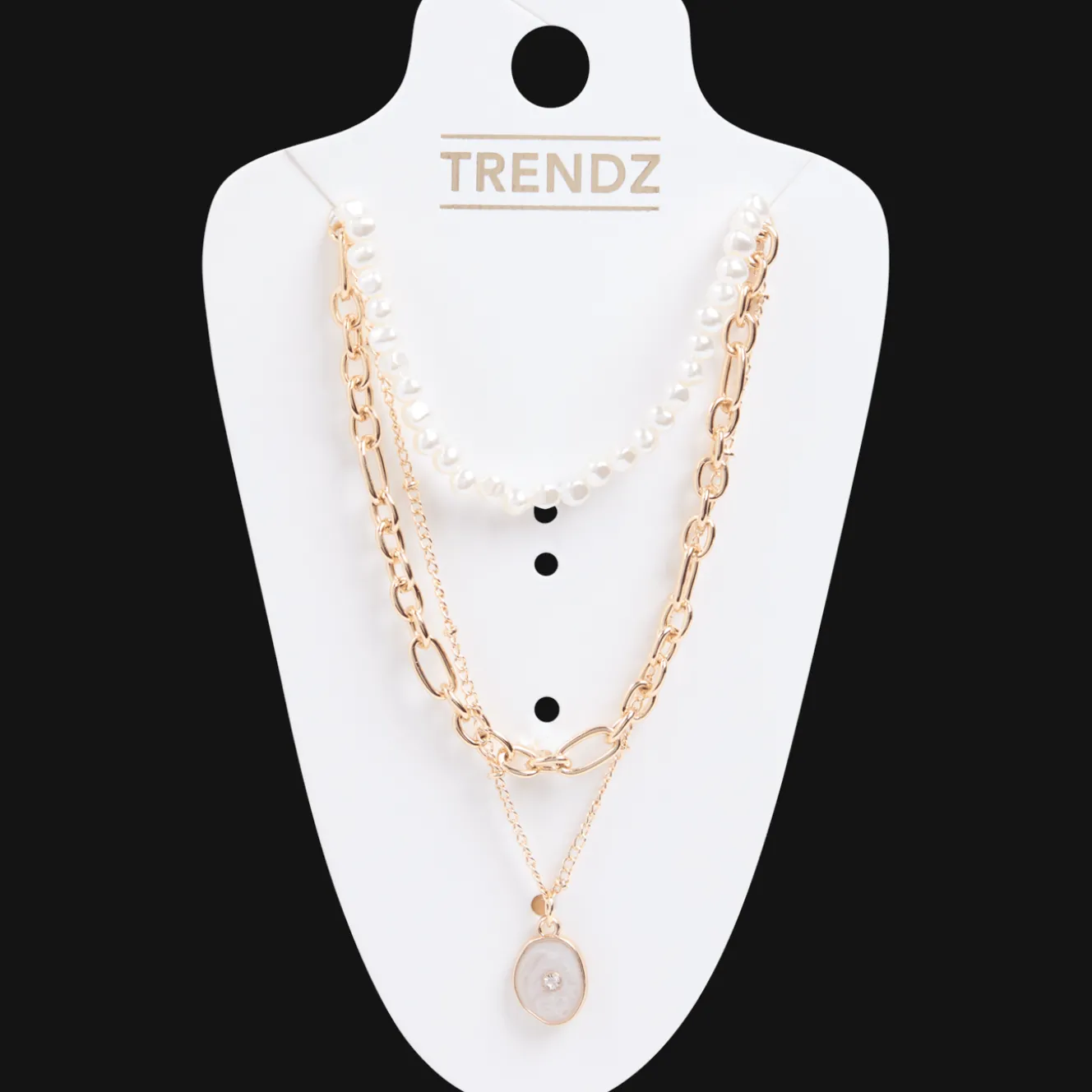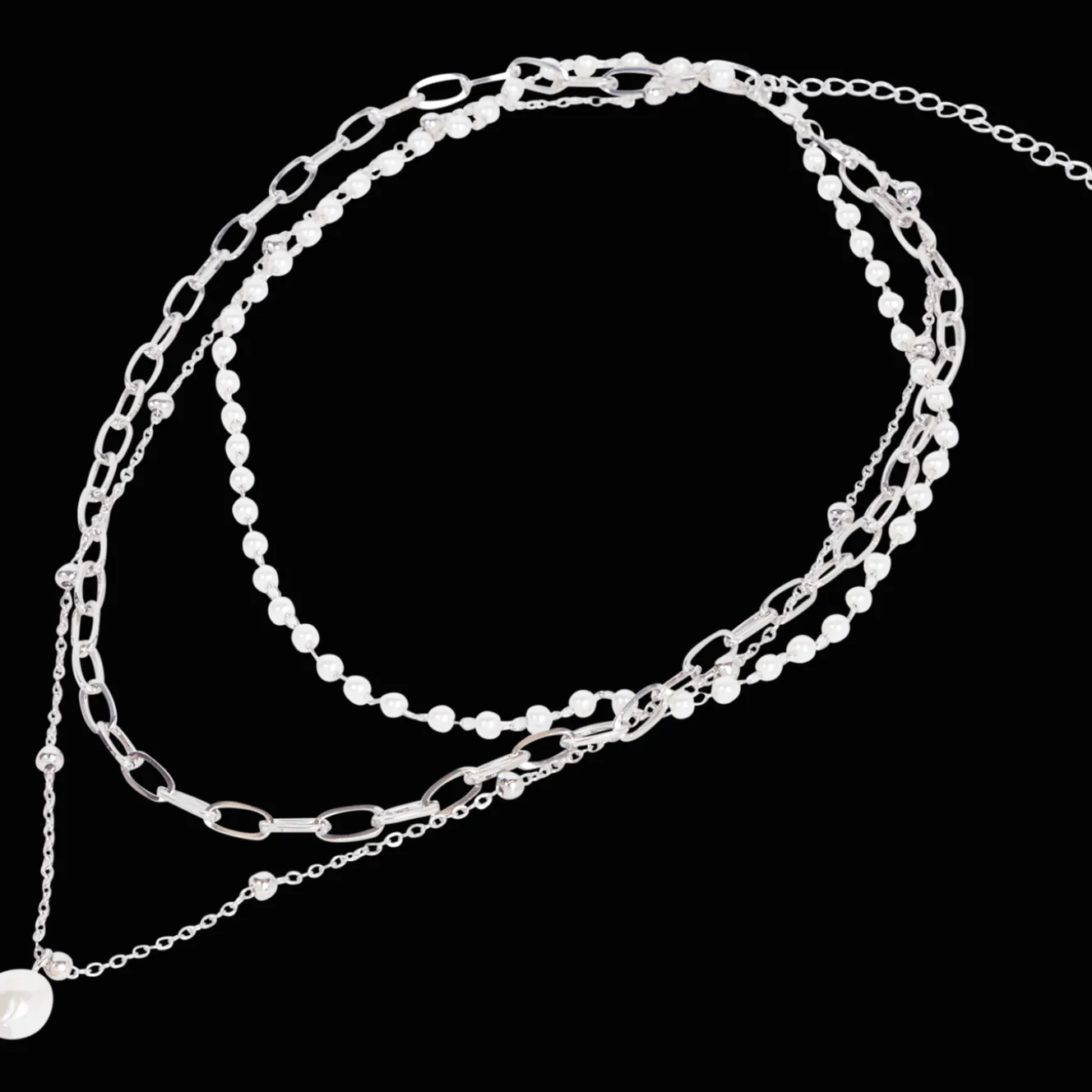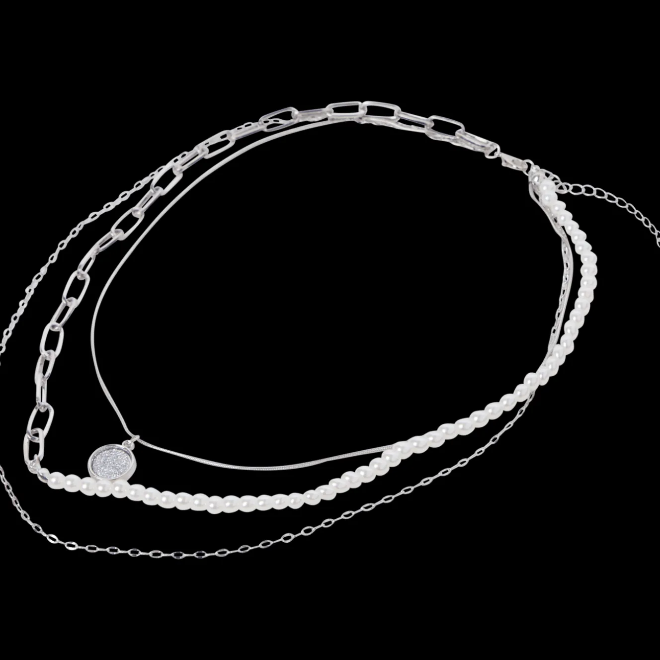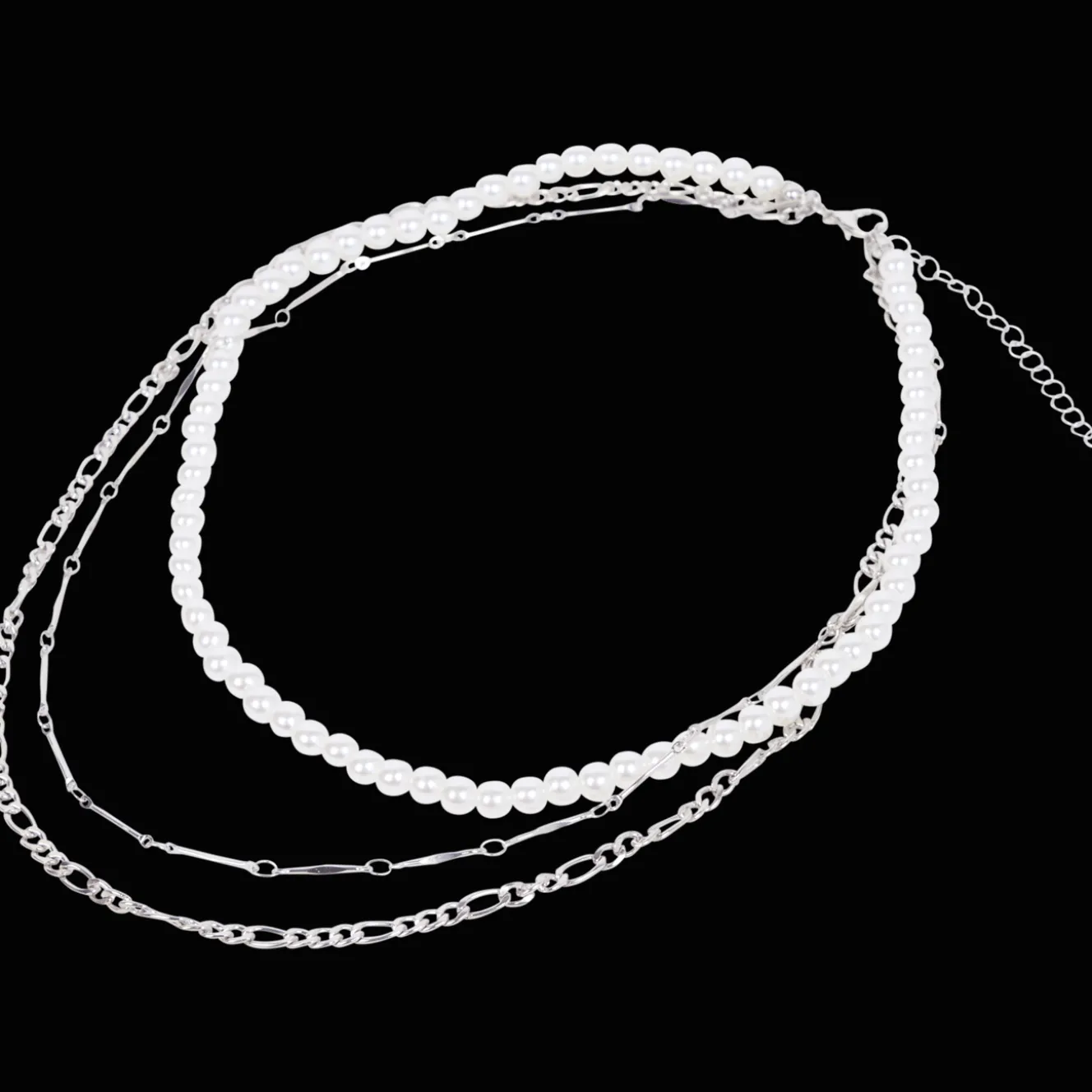 Deze leuke ketting bestaat uit drie losse kettinkjes. Iedere ketting heeft verschillende soorten schakels, bedels en parels.