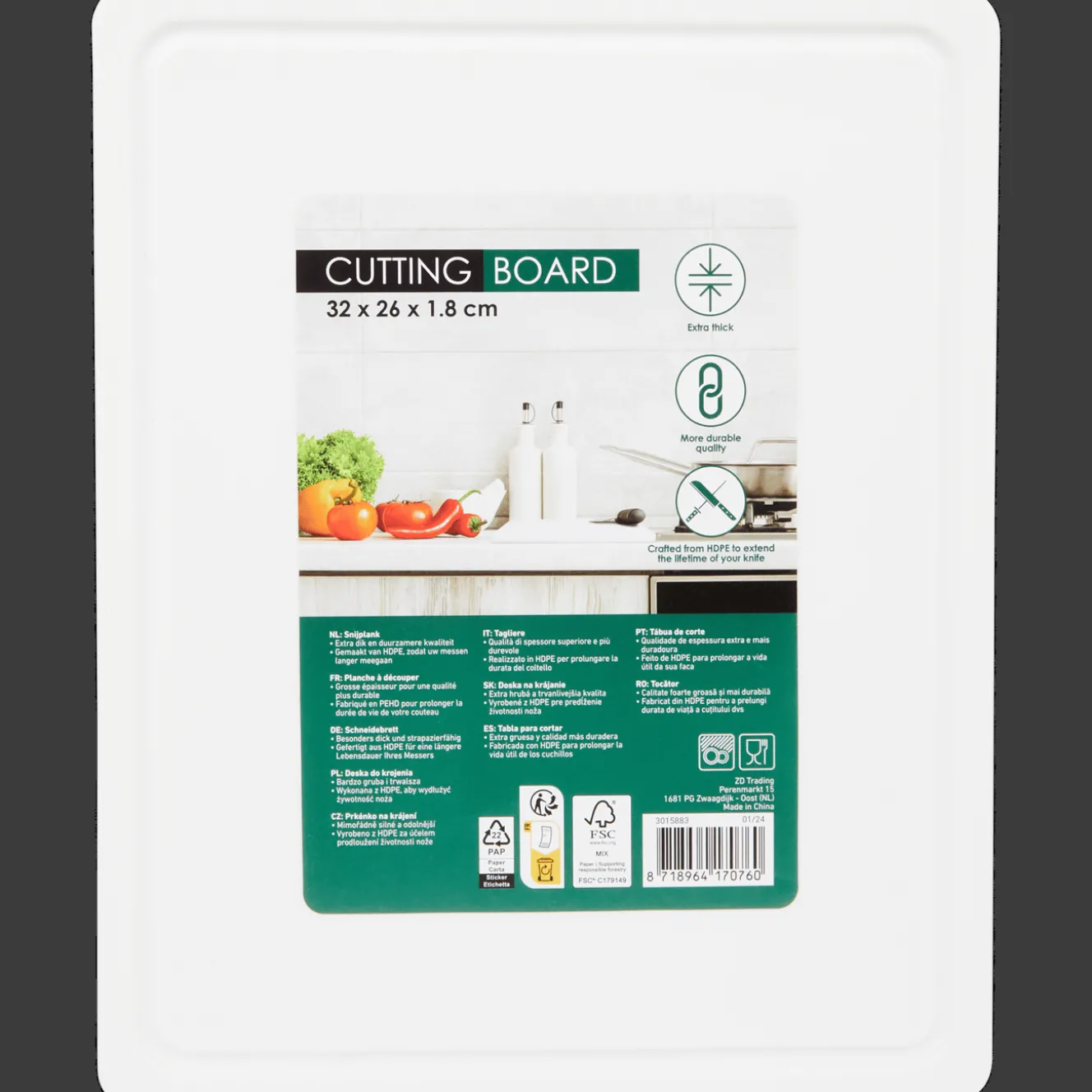 Snijplank gemaakt van HDPE, wat er samen met de extra dikte van de plank voor zorgt dat je messen langer meegaan.