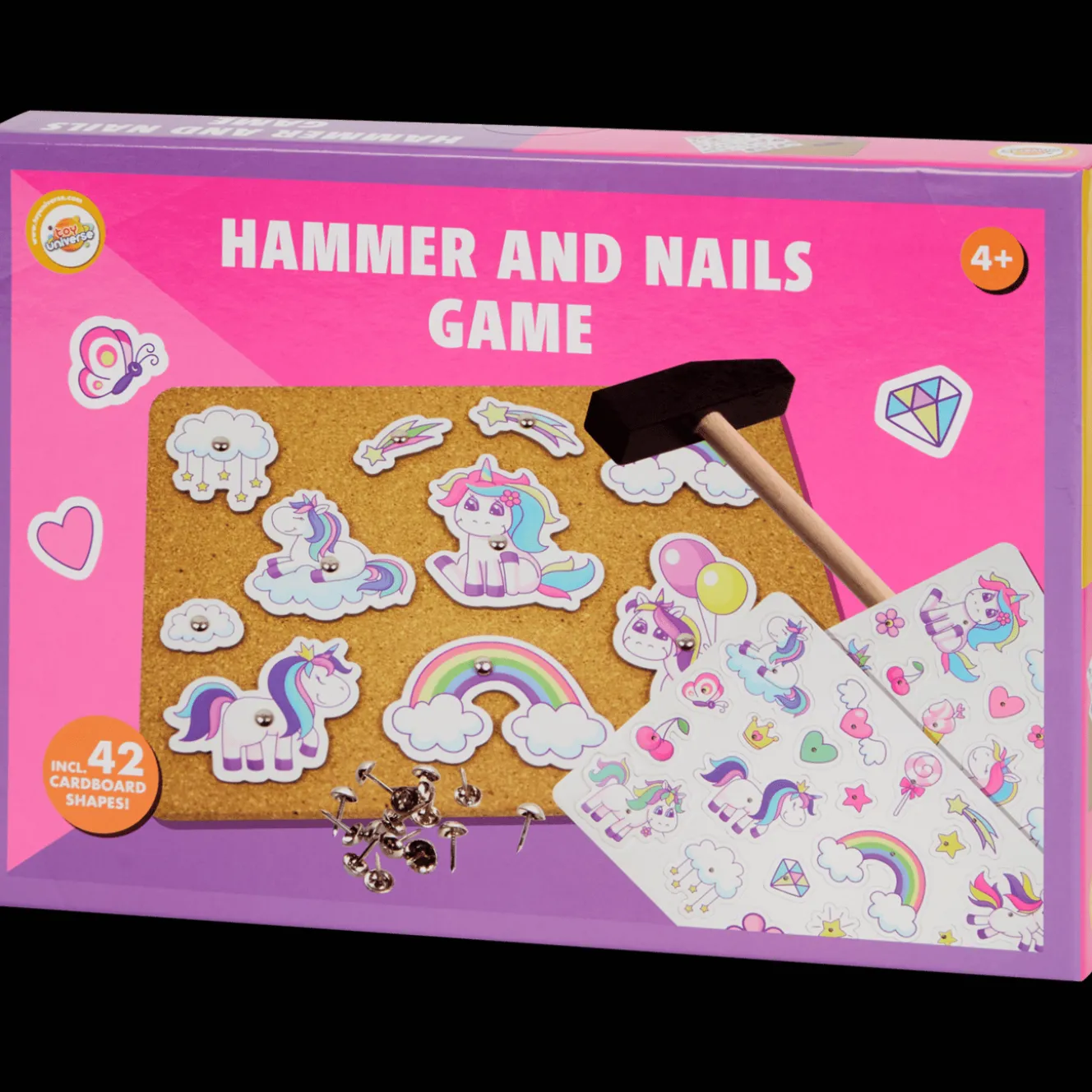 Met dit Hamertje Tik spel maakt je kind zelf mooie en kleurrijke creaties door de gekleurde vlakken op de plaat vast te spijkeren.