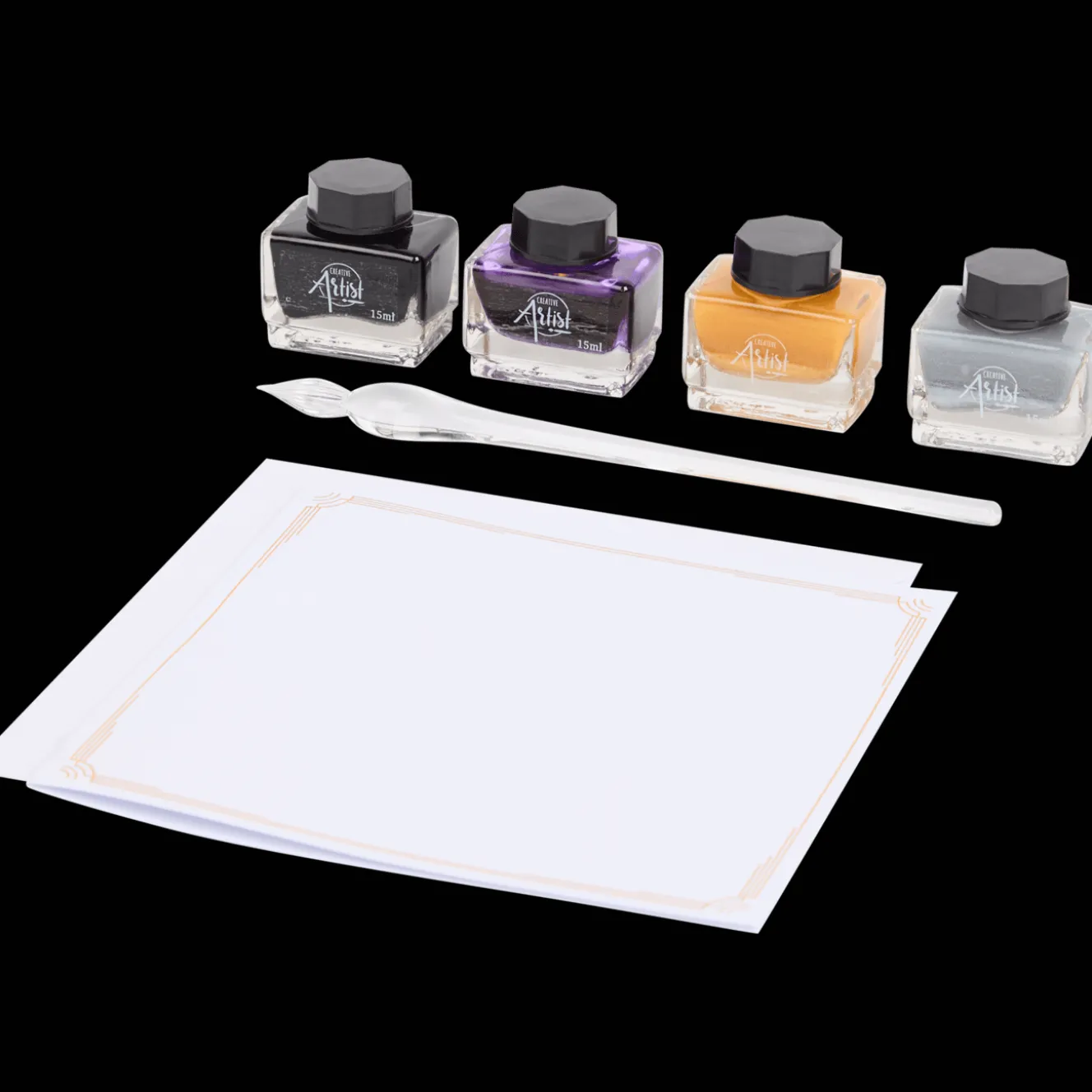 Met deze luxe glazen pennenset schrijf je de allermooiste kaartjes. De set bestaat uit:1x glazen pen5x dubbele kaarten5x enveloppen4x 15 ml gekleurde inkt