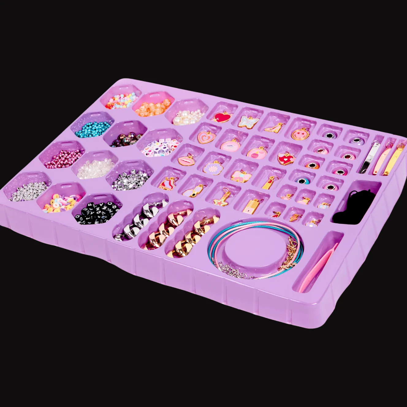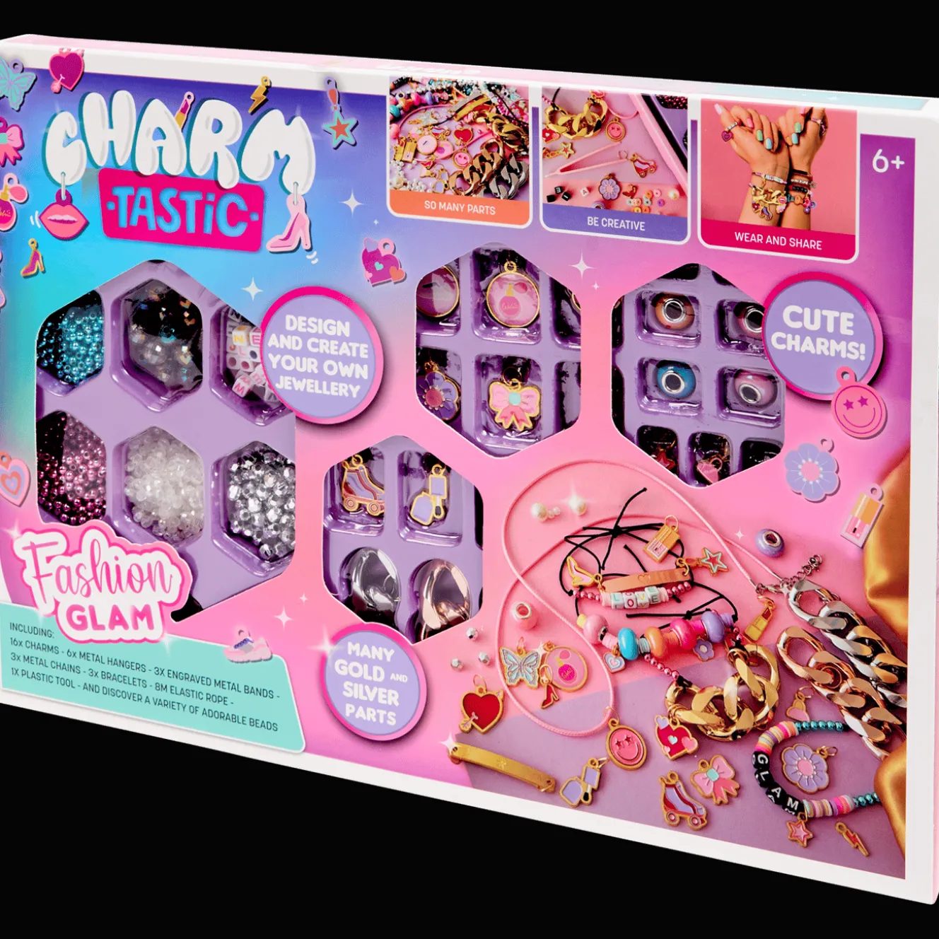 Het is superleuk om je eigen bedelsieraden te maken! Met 16 bedels, 6 metalen hangers, 3 gegraveerde metalen banden, 3 metalen kettingen, 3 armbanden, 8 meter elastisch touw, kunststof gereedschap en een verscheidenheid aan schattige kralen, kun je eindeloos creatief bezig zijn en je eigen unieke sieraden ontwerpen.