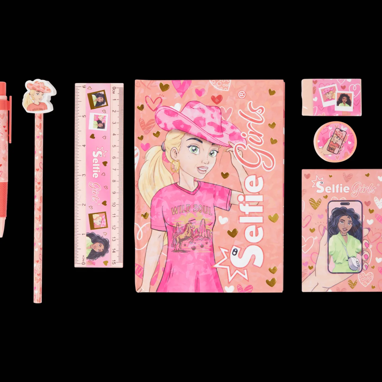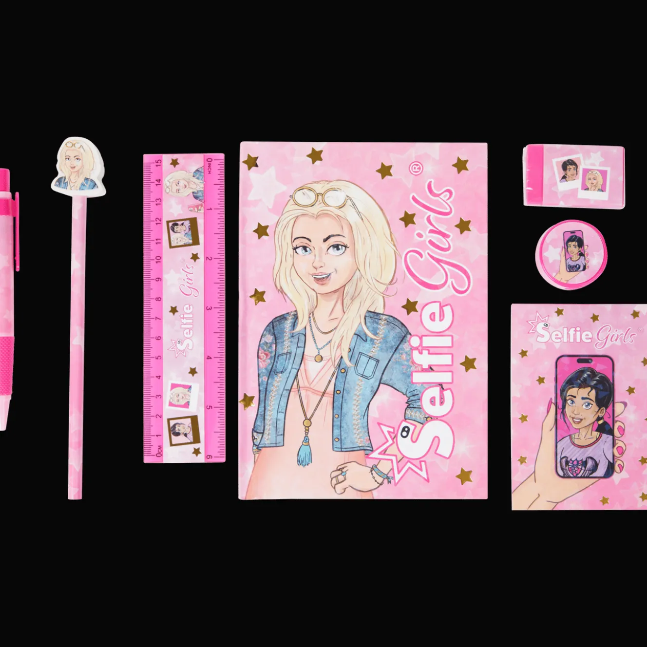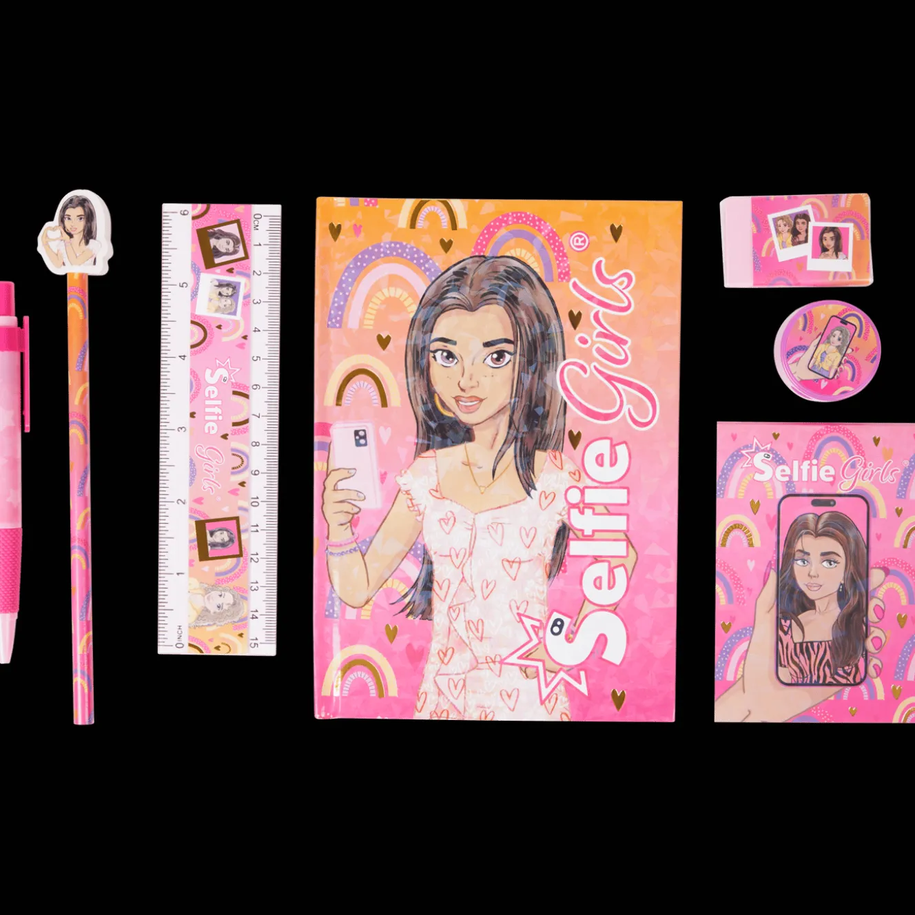 Deze set met schrijfspullen bestaat uit een notitieblok, kladblok, liniaal, balpen, potlood topper, potlood, gum en puntenslijper. En dat allemaal in een handige etui om het makkelijk mee te nemen.
