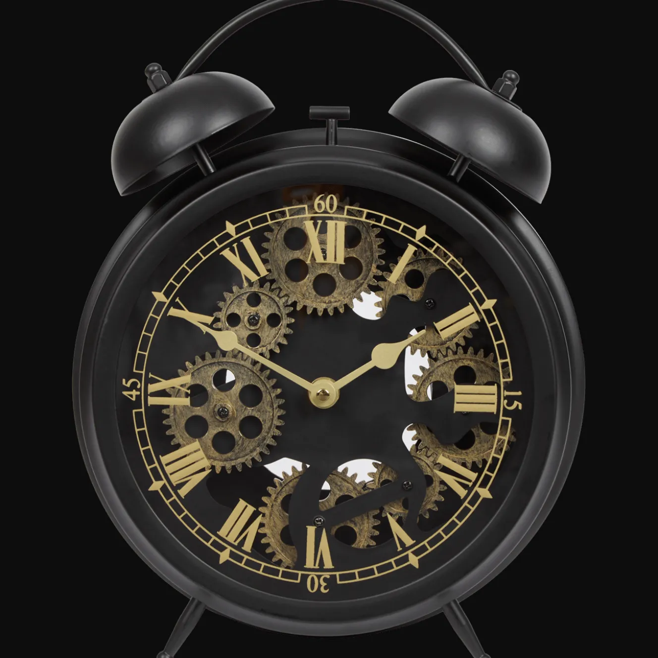Stijlvolle klok met bellen en zichtbare tandwielen.
